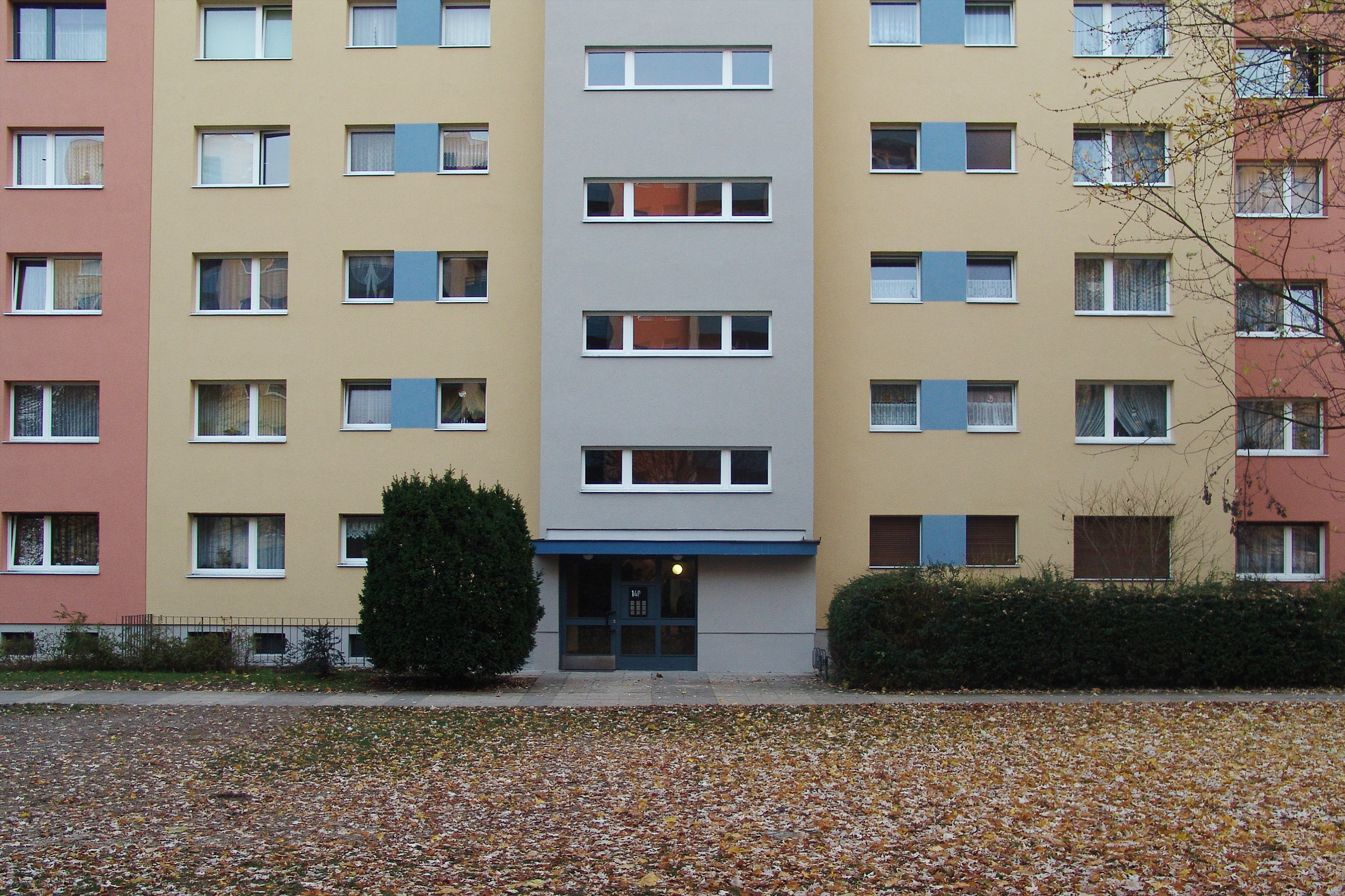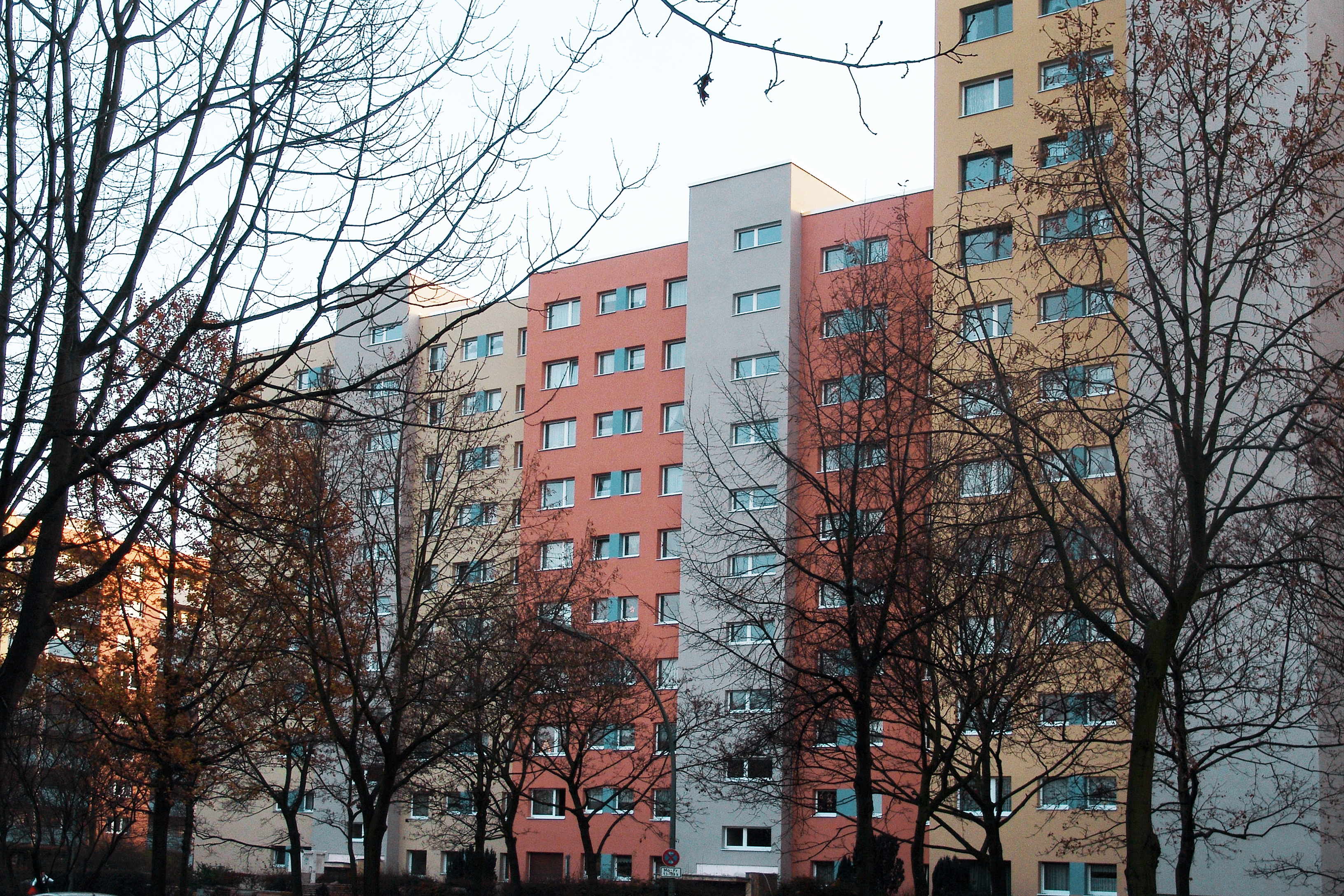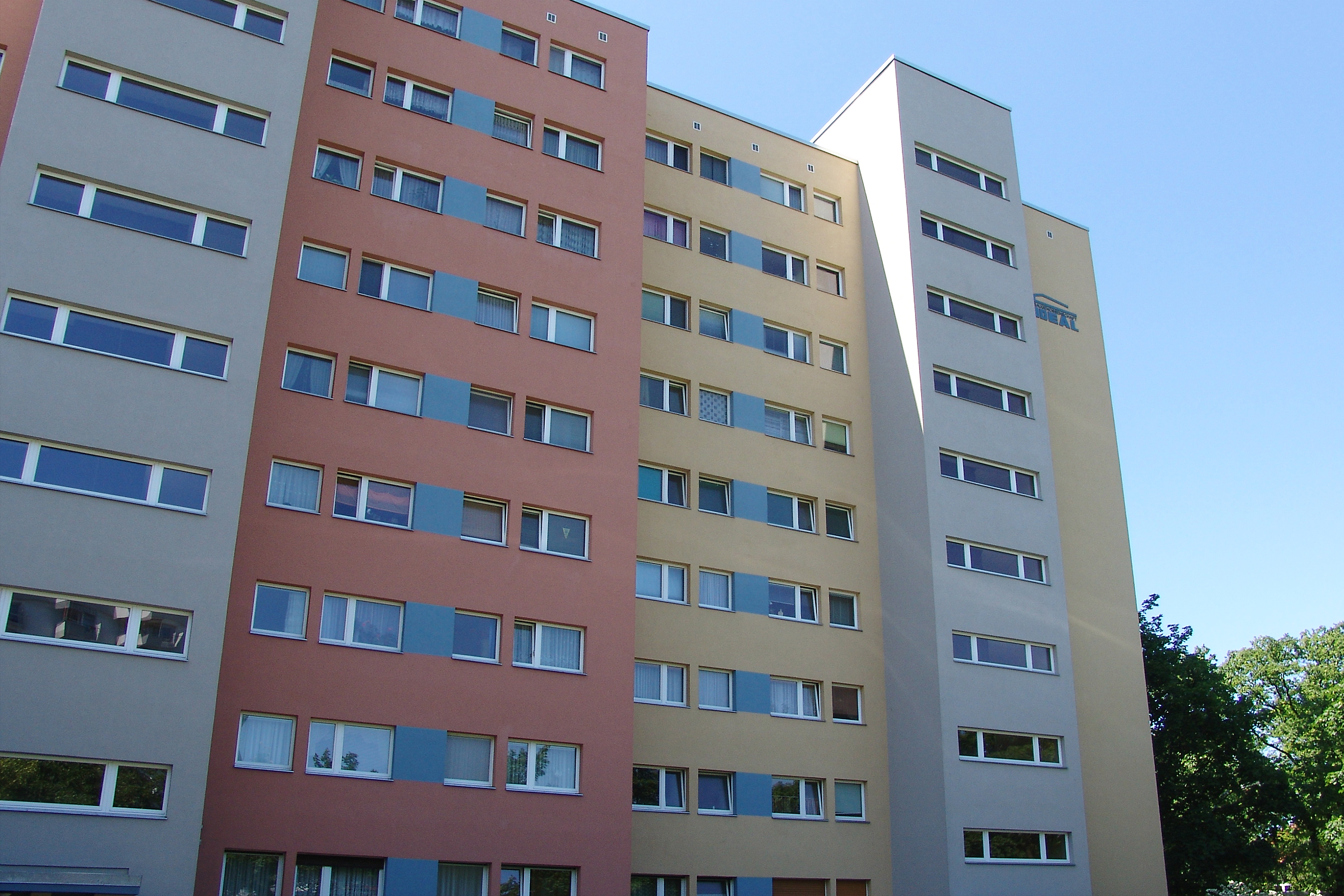 Ausgangspunkt des Konzeptes ist das Blau des Logos der Baugenossenschaft IDEAL, das auf Fensterspiegeln, Balkonbrüstungen und Eingangsvordächern eingesetzt ist. Als Grundtöne für die Gebäude sind warme Erdtöne von rotem Ziegel bis klassischem hellen Ocker in unterschiedlichen Nuancen eingesetzt, die durch ihren traditionellen Einsatz an Gebäuden eine hohe Akzeptanz haben. Kombiniert sind die eingesetzten Farbtöne mit neutralem Grau, das auf Sockel, Balkonen, Eingängen und Treppenhäusern die Fassaden gliedert. Die Wohnanlage erhielt mit der Gestaltung eine abwechslungsreiche Erscheinung, die aber auch die Zusammengehörigkeit der Gebäude zeigt.