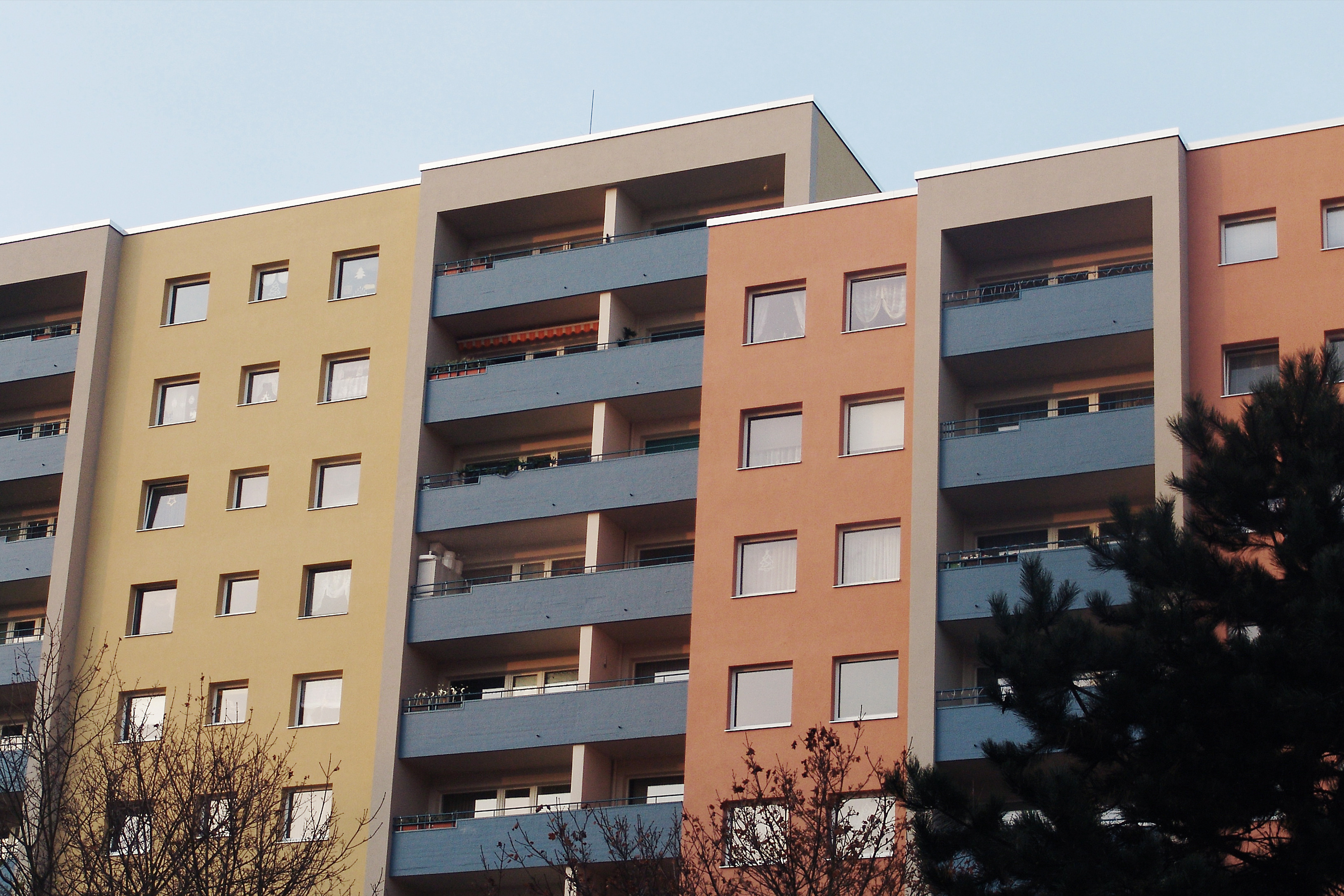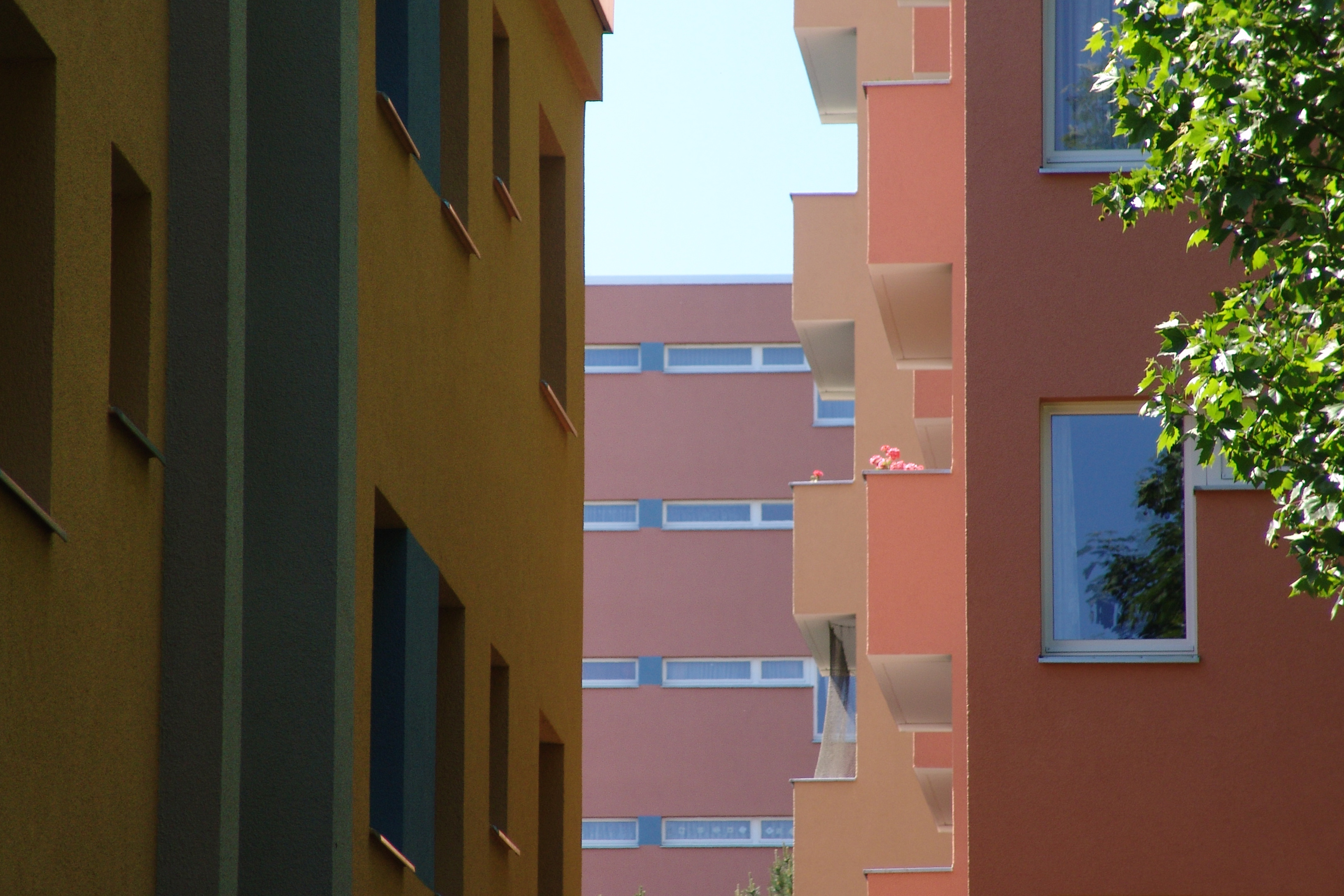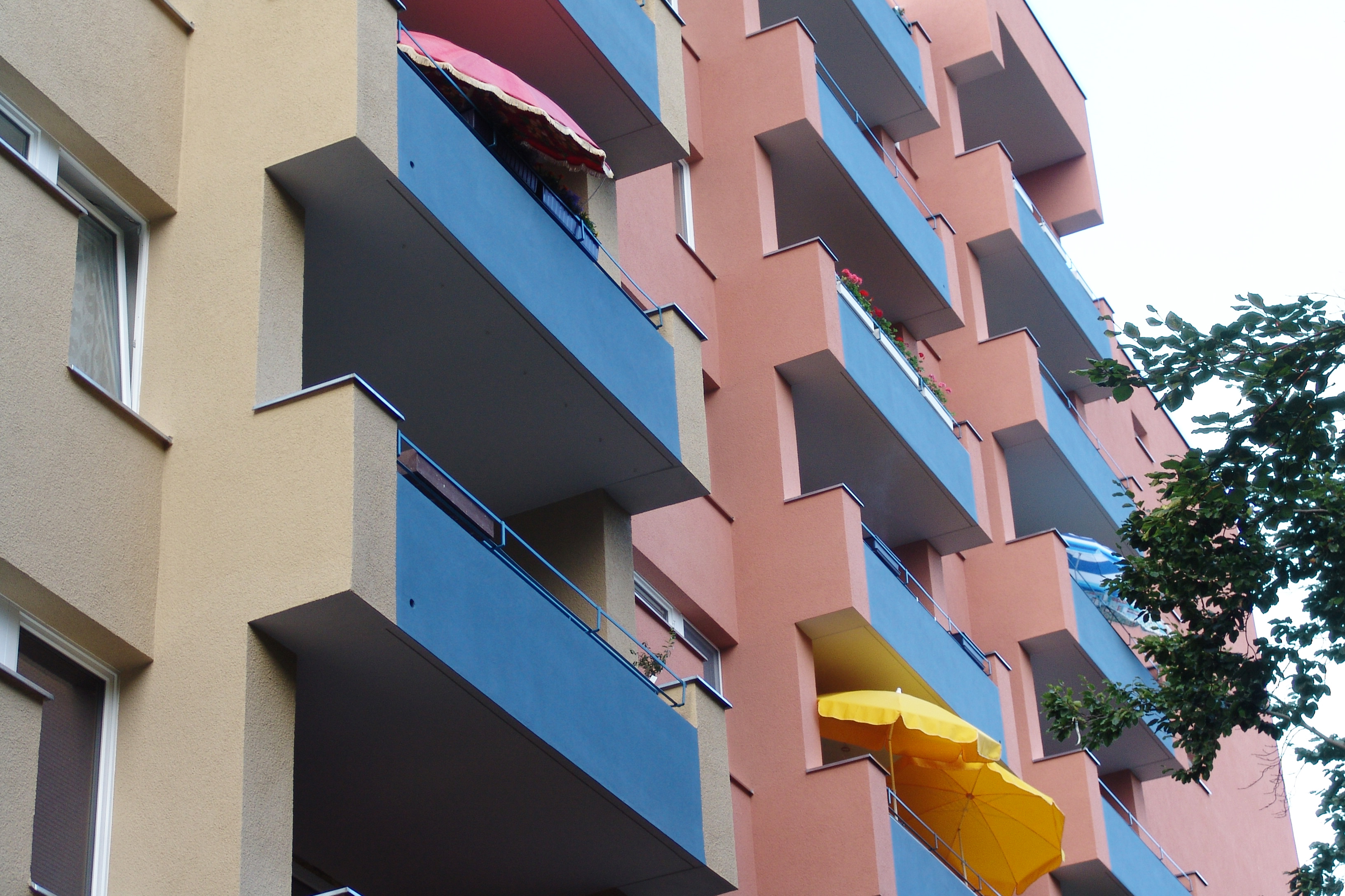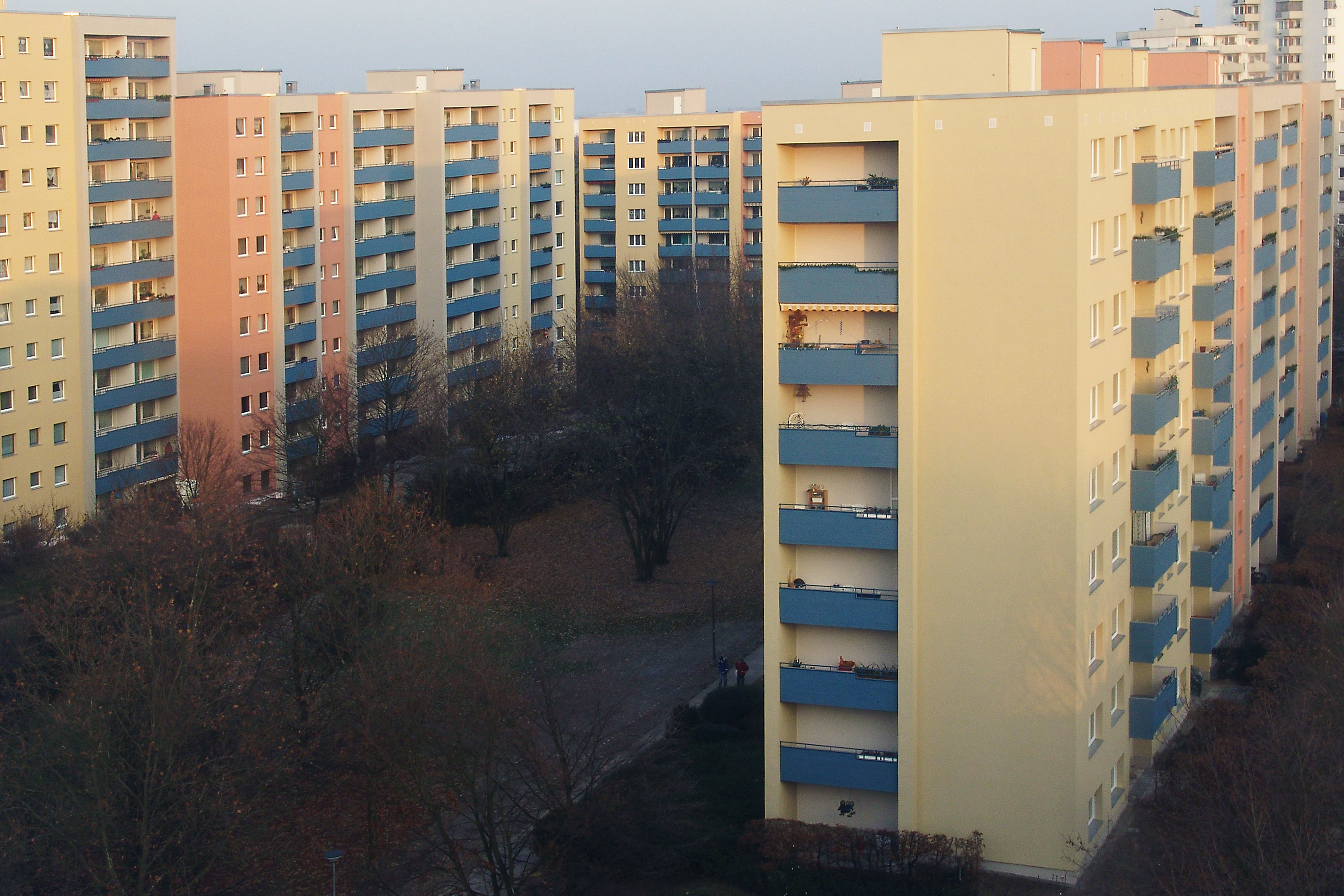 Ausgangspunkt des Konzeptes ist das Blau des Logos der Baugenossenschaft IDEAL, das auf Fensterspiegeln, Balkonbrüstungen und Eingangsvordächern eingesetzt ist. Als Grundtöne für die Gebäude sind warme Erdtöne von rotem Ziegel bis klassischem hellen Ocker in unterschiedlichen Nuancen eingesetzt, die durch ihren traditionellen Einsatz an Gebäuden eine hohe Akzeptanz haben. Kombiniert sind die eingesetzten Farbtöne mit neutralem Grau, das auf Sockel, Balkonen, Eingängen und Treppenhäusern die Fassaden gliedert. Die Wohnanlage erhielt mit der Gestaltung eine abwechslungsreiche Erscheinung, die aber auch die Zusammengehörigkeit der Gebäude zeigt.