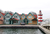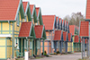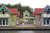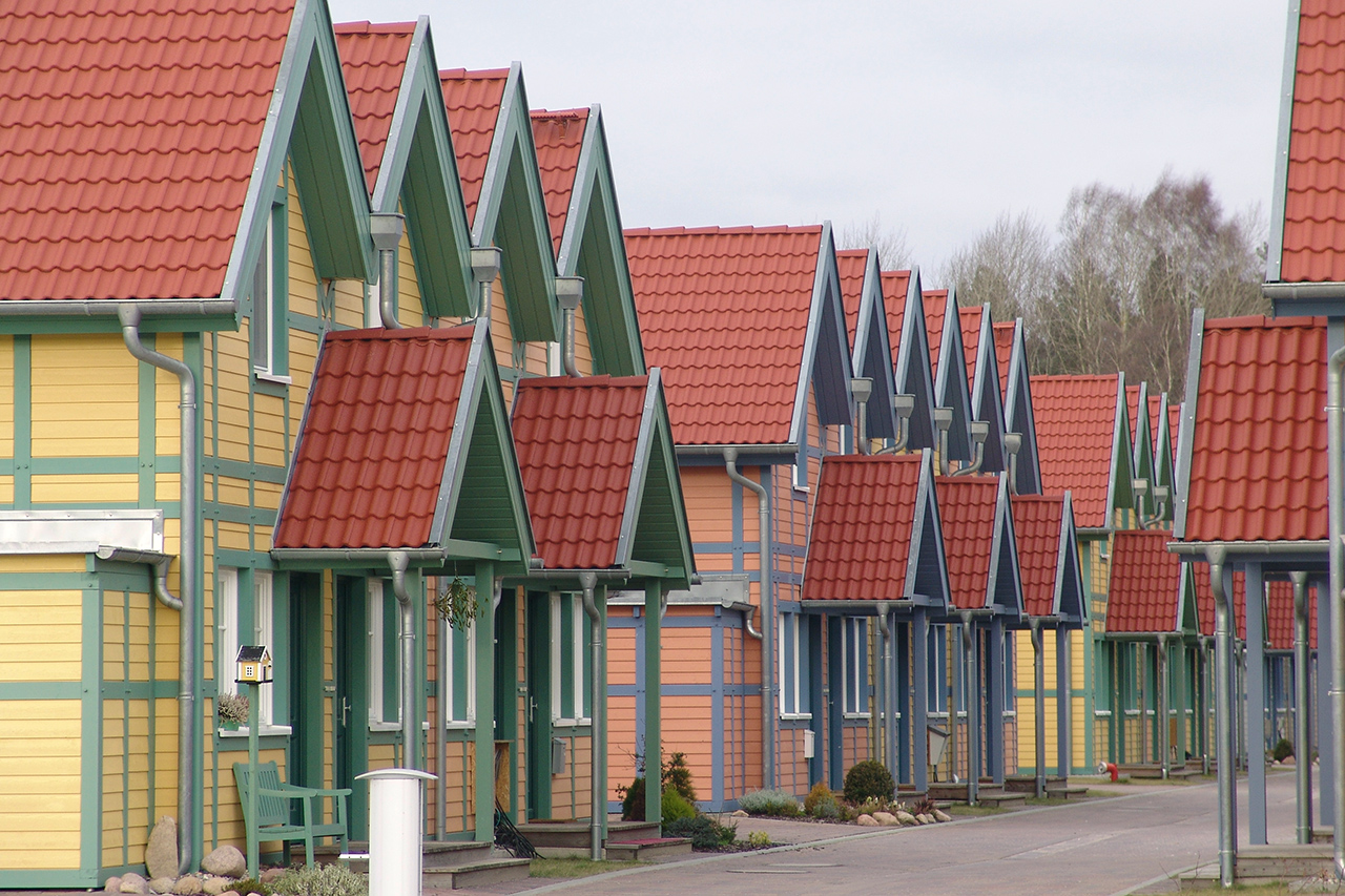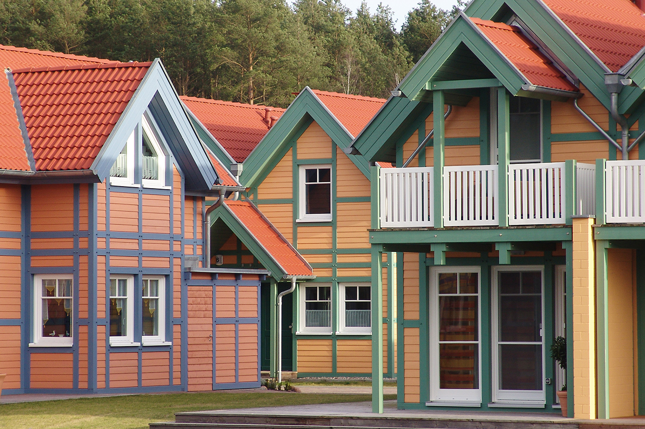 Das Farbgestaltungskonzept für die Anlage basiert auf einem Musterhaus im skandinavischen Stil in den Farben Gelb und Blau . Mit Bezug auf die Helligkeit, die Farbtemperatur und die Sättigung des bestehenden Hauses wurden zusätzlich fünf verschiedene Farbvariationen für die gesamte Anlage abgeleitet. Daraus ergab sich eine ansprechende Gesamtfarbigkeit, die abwechslungsreich ist und die Anlage gleichzeitig aus einem Guss erscheinen lässt.