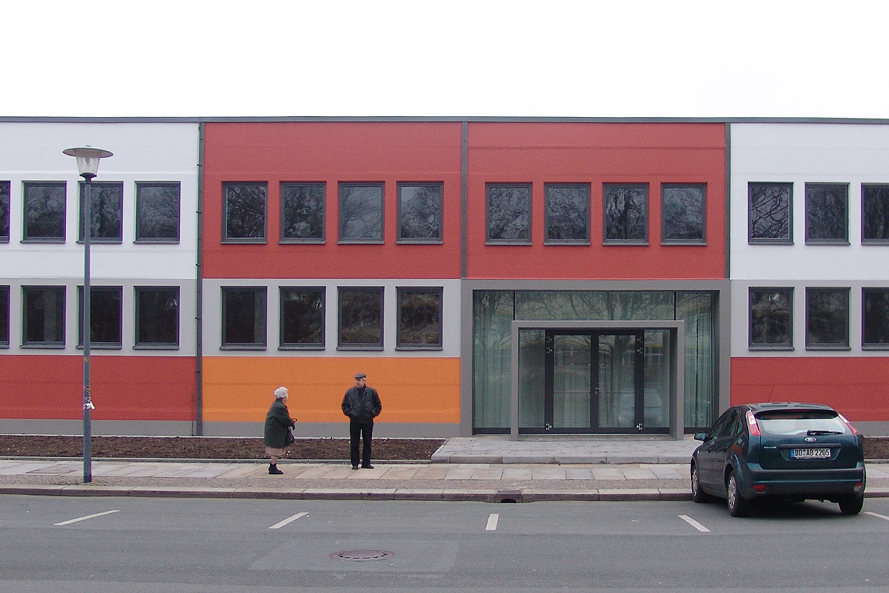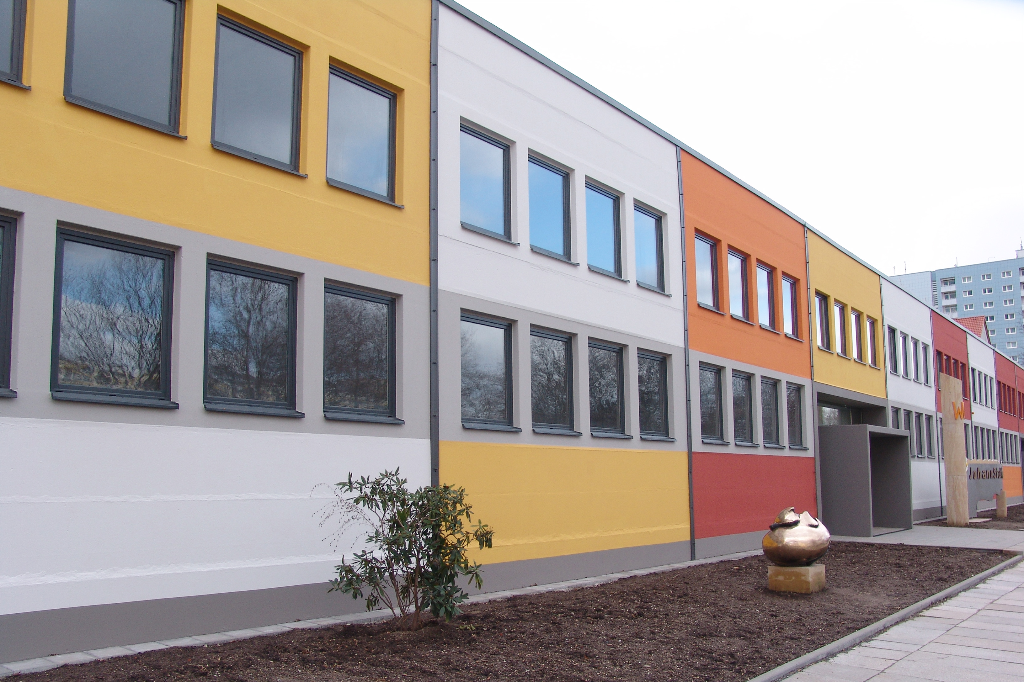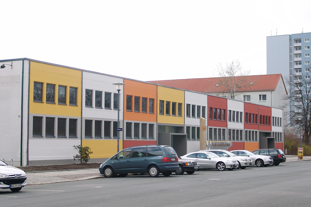 Die Außengestaltung sollte eine Signalwirkung bekommen und wurde von der orangen CI- Farbe der WGJ abgeleitet. Das lange traufständige Gebäude wurde in Modulbauweise erstellt. Diese Module geben die farbliche Gliederung vor. Die asymmetrisch angelegten Farbtöne, aus dem Bereich von Rot bis Gelb des Farbkreises, stehen dabei stellvertretend für die Vielfältigkeit der Johannstadt. Auch im Innenbereich wurde das Orange der WGJ zitiert und mit einem einladenden Grün kontrastiert.