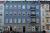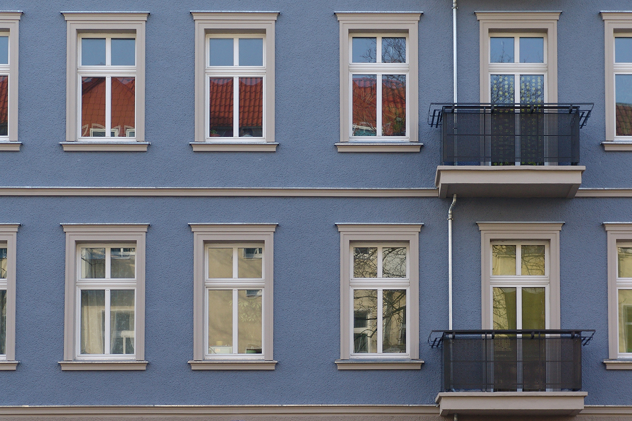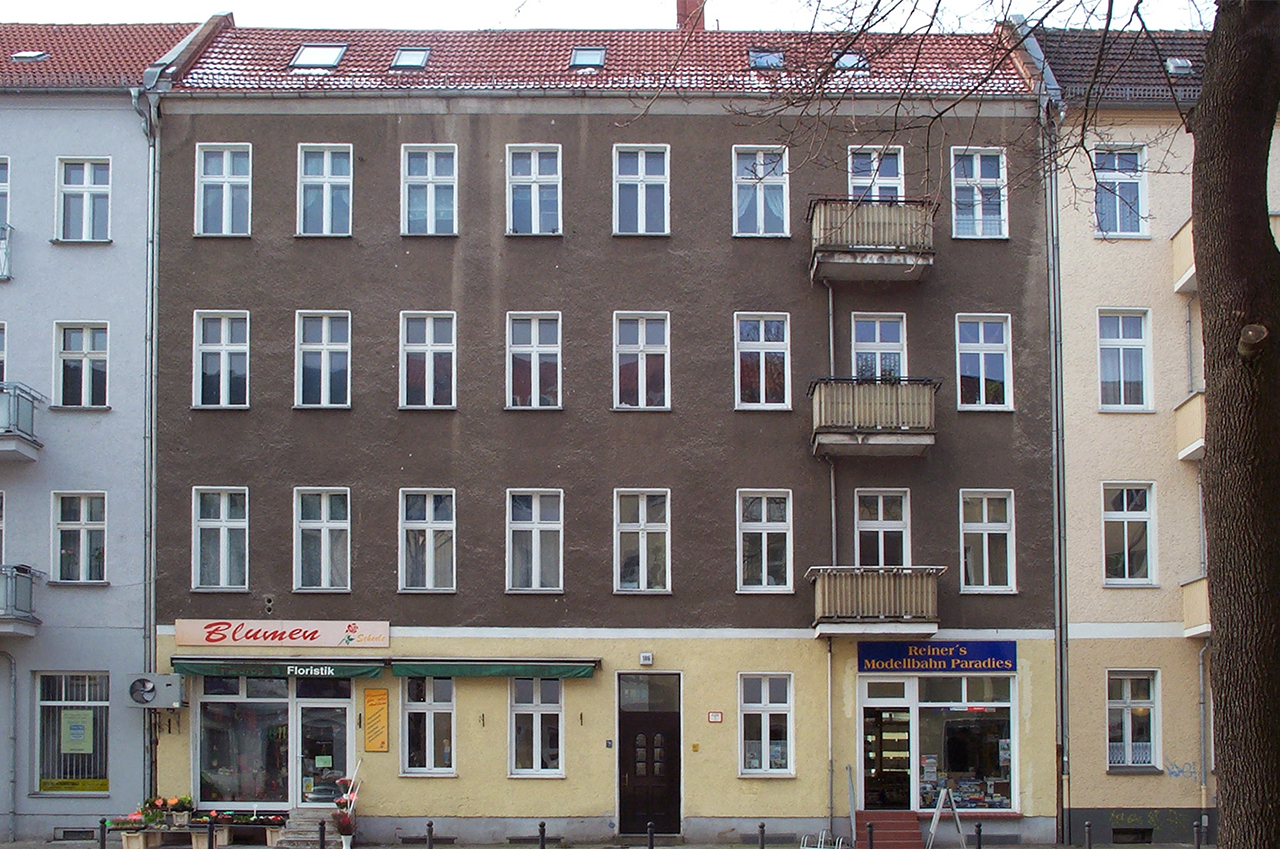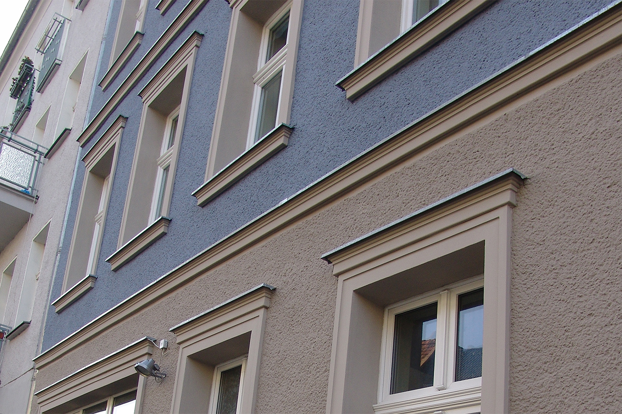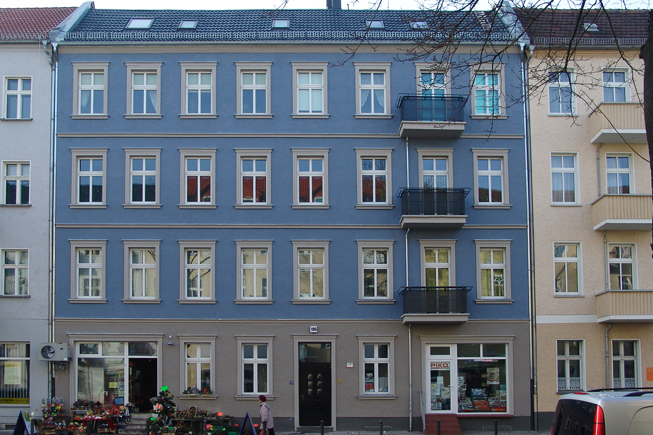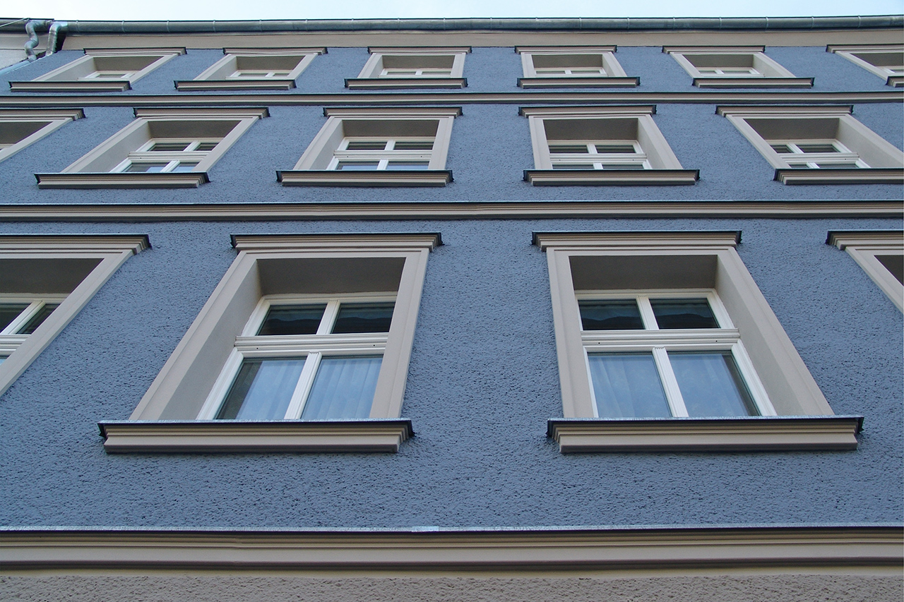 Das Gebäude war ein typisches vom Stuck befreites Berliner Mietshaus, das wieder eine historische Fassade erhalten sollte. Die Gliederung ist schlicht gehalten und nimmt die wichtigsten Elemente einer klassischen Fassade auf – Verdachungen, Faschen, Kranz- und Fenstergesimse. Als Farbton war ein Blau gewünscht und so war der dunkle und vergraute Farbton mit den Auftraggebern schnell gefunden. Durch die Kombination mit einem steinfarbigen Grau auf den Profilen erhielt die Fassaden eine klassisch-elegante Erscheinung, die im Straßenzug eine angenehmen Akzent setzt.