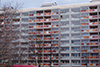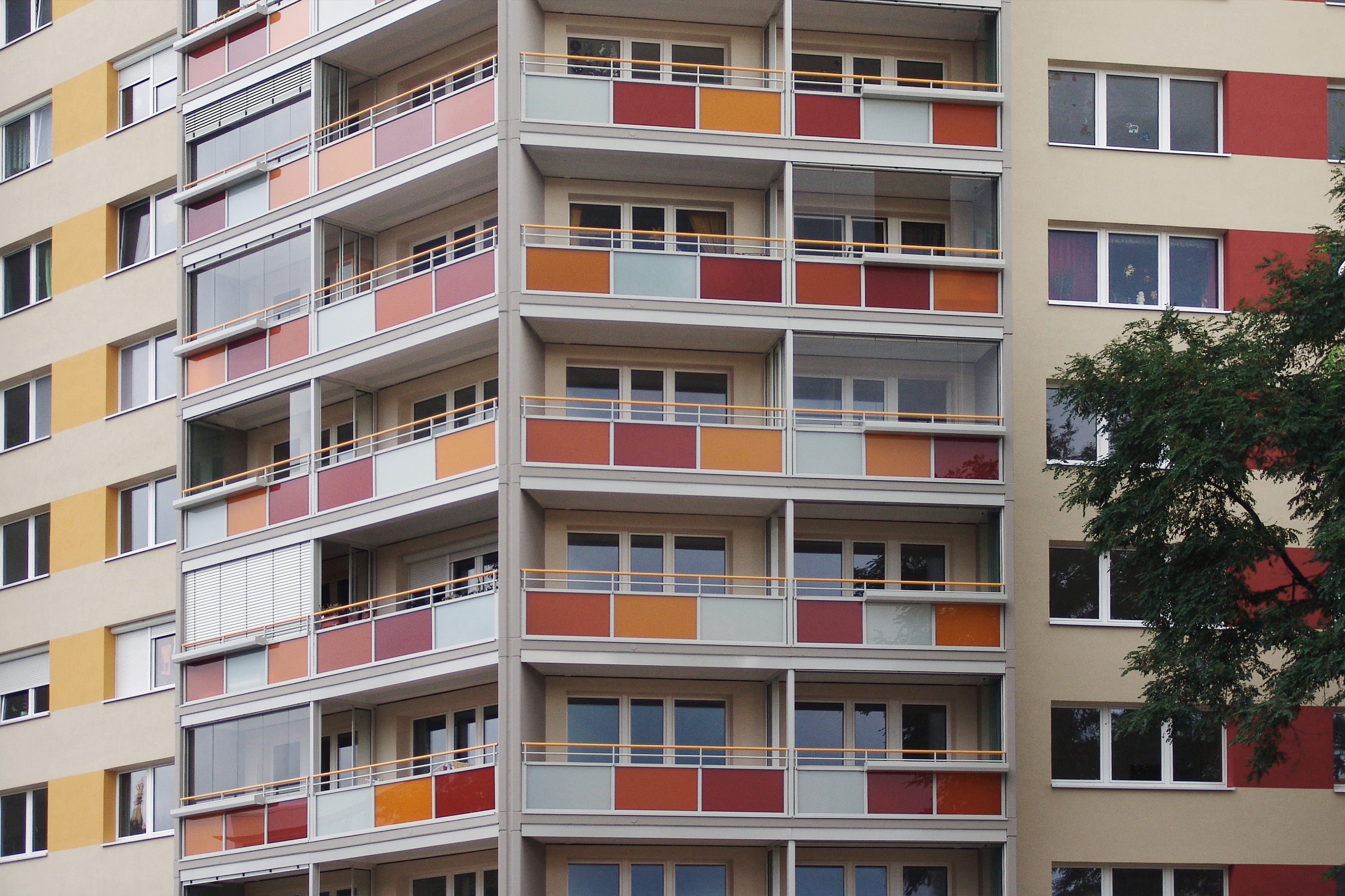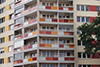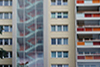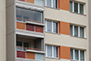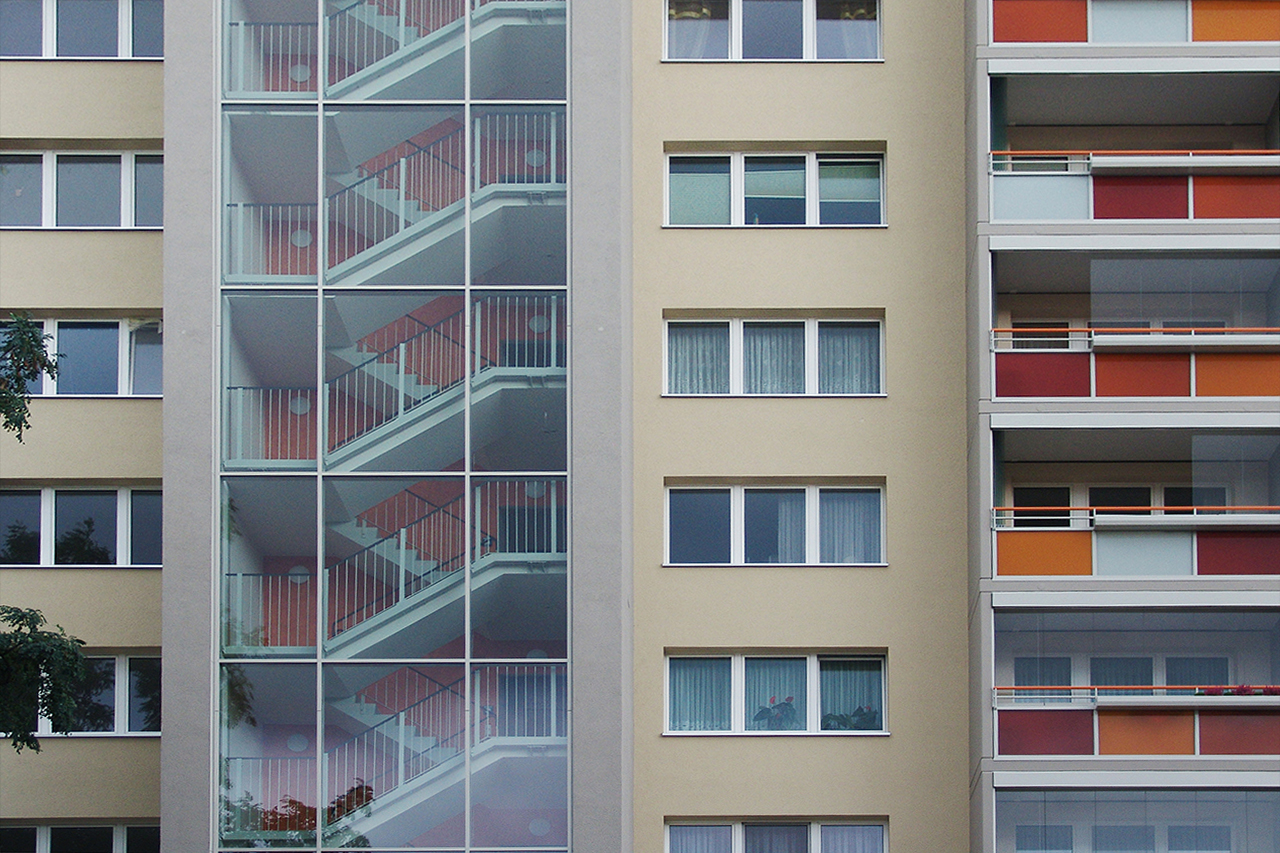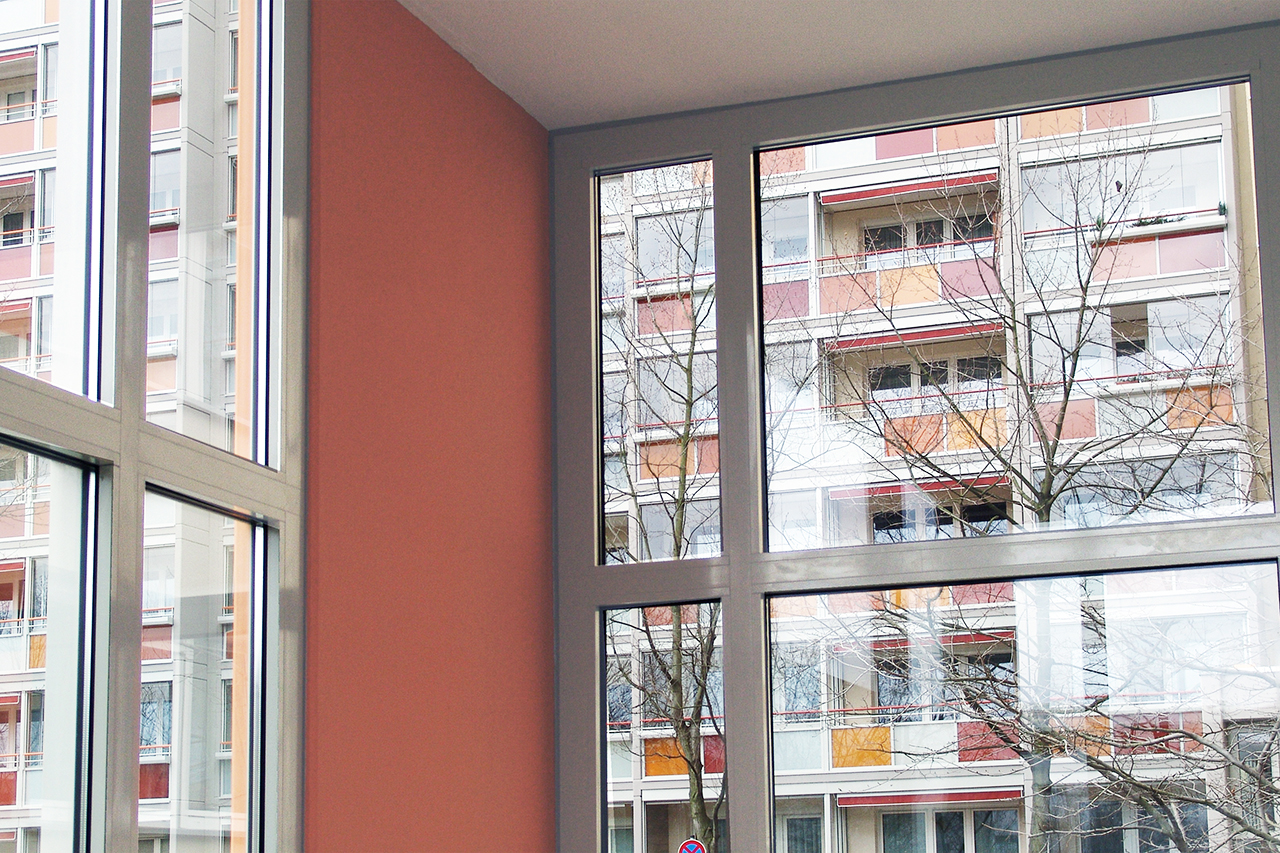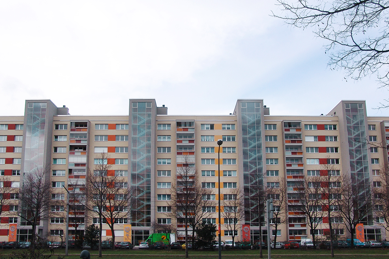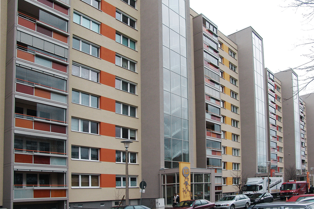 Die Farbgestaltung geht auf die umliegende historische Bebauung ein. Sie nimmt aufgehellte Steinfarben auf und kontrastiert sie mit den Farbtönen der WG-Johannstadt, die sich auch im weiteren Umfeld wiederfinden. Den Gebäuden werden jeweils ein Farbton von drei Akzentfarben zugeordnet, die einem warmen Segment aus dem Farbspektrum entsprechen. An den Balkonbrüstungen finden sich diese Akzenttöne in einer das starre Muster der Loggien auflösenden Anordnung, die die vertikale Gliederung der Eingangsfassade betont und auf der Rückseite zu einer texturartigen Flächengliederung führt. Der Baukörper wird durch den hellen Sandton zurückgenommen, behält jedoch, durch die Assoziation zum Sandstein, seine Dominanz und vermittelt eine solide Architektur, die durch ihre Akzente eine freundliche Erscheinung erhält.