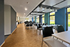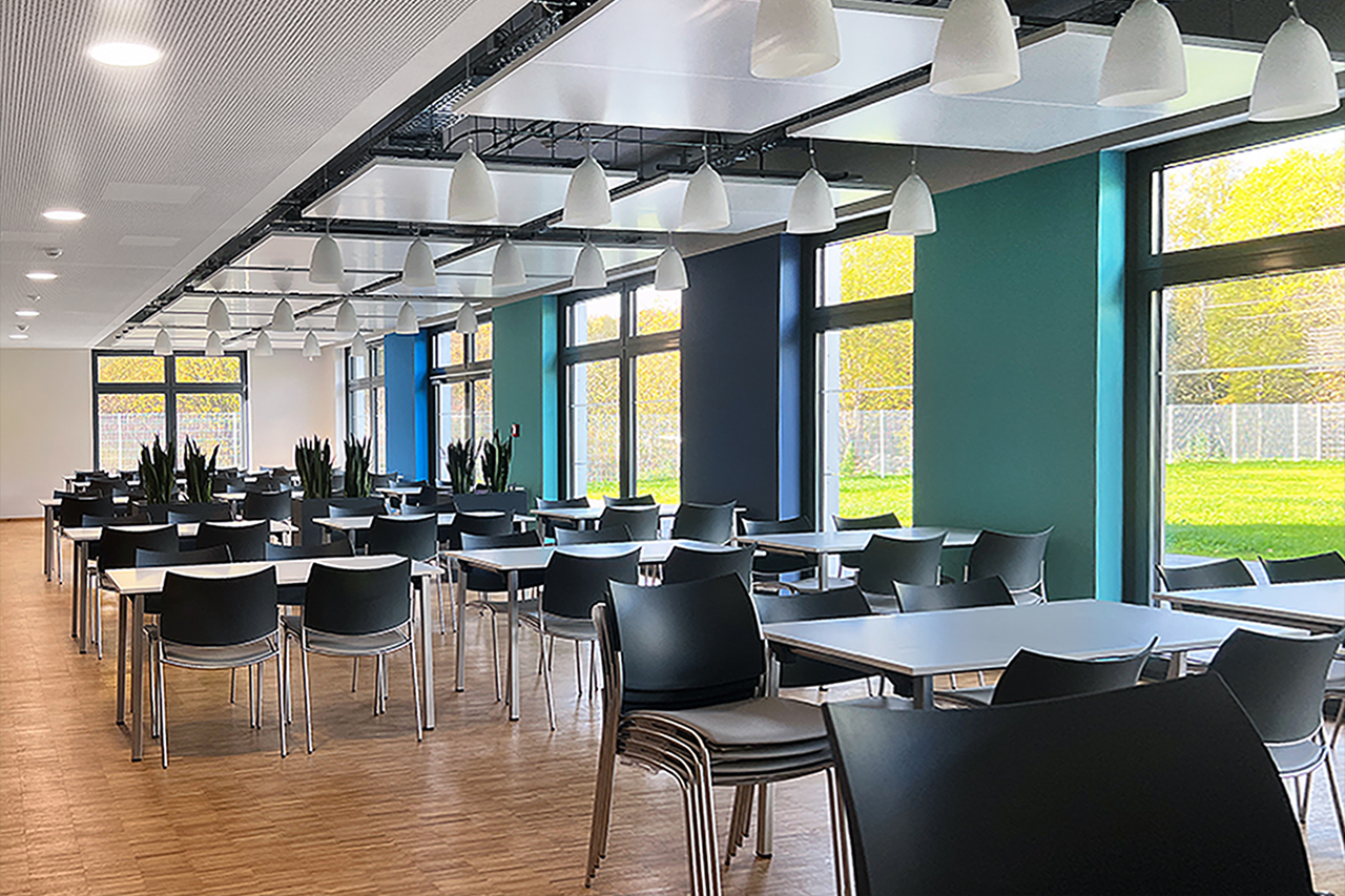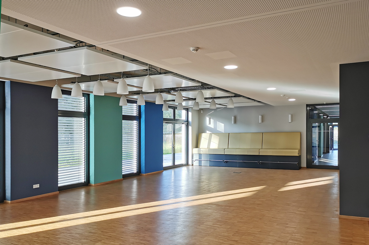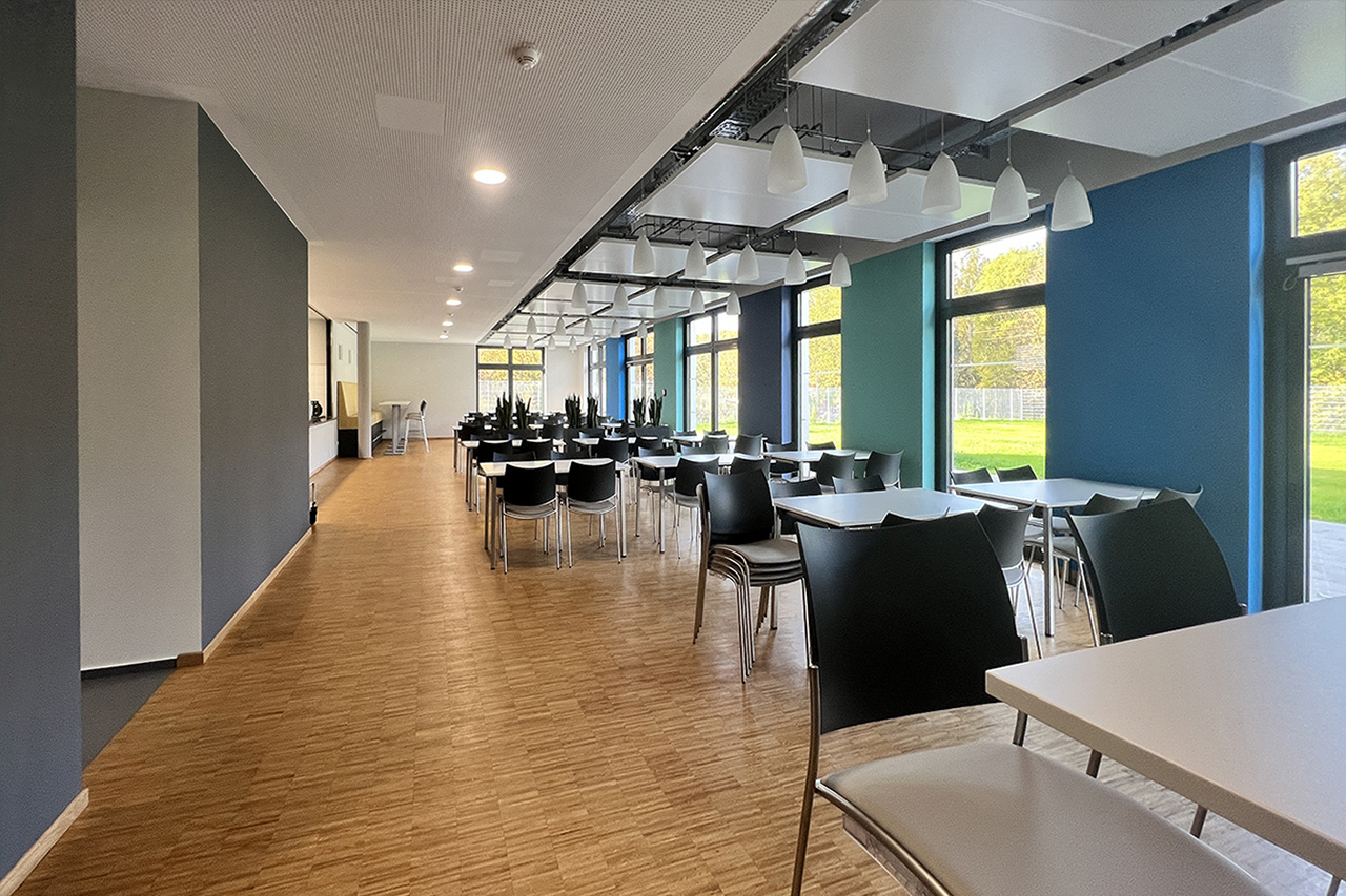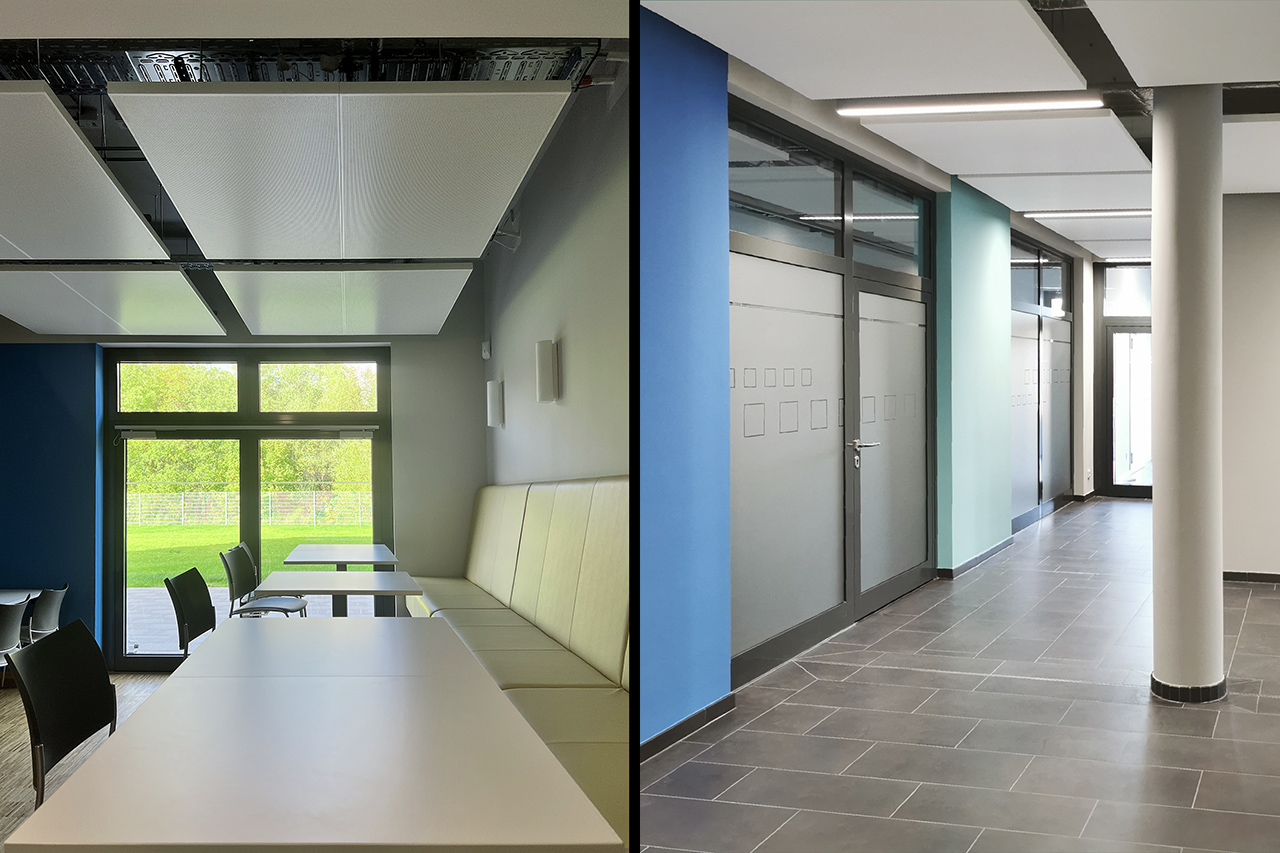 Die Vorschläge für die gestalteten Wände des Foyers und des Treppenhauses wurden nicht umgesetzt und sich für eine neutrale Ausführung entschieden. In Teilen der Flure und in der Kantine wurden die an der Längsseite des Gebäudes ausgerichteten farbigen Akzentflächen in Form von Fensterspiegeln eingesetzt. Die Basisfarben der Wände, Türen und Decken sind in unterschiedlichen Grautönen gehalten, so dass die Akzentfarben für sich wirken konnten. Lediglich in der Kantine steht der warme Holzton des Parkettbodens in einem anregenden und komplementären Kontrast zu den kühlen Farbakzenten zwischen den Fenstern. Dieser Warm-Kalt-Kontrast schafft eine ausgeglichene und ansprechende Atmosphäre, die großen Zuspruch erfährt.